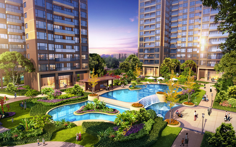 園林設計以現代景觀意境為設計理念,結合項目的空間結構,運用巧妙的設計手法,演繹出一條帶有層次的情緒歸家動線(到達→過渡→中心花園→過渡→組團花園),園林面積共1.8萬㎡,采用總體思維空間造景手法,打造多功能複合型景觀,栽種了金浦桃、黃金榕、黃龍船花、鶴望蘭等名貴樹/花種;項目打造了18米寬闊氣大門,給予業主五星酒店尊貴前廷歸家感受;社區内有籃球場、兒童遊樂場,太極廣場、全齡遊泳池、遊步道、聚集庭院,打造溫馨自然閑适後苑居家氛圍。